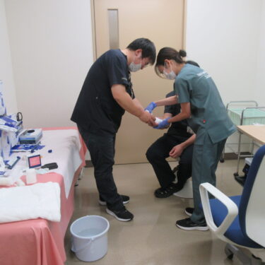 理事長からの激励の言葉から始まり、最初は緊張した様子でしたが、普段救急外来で行っていることであるため、実際開始してみるとテキパキ動いており、先生方の成長を感じました。